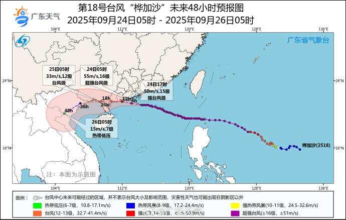广东省气象台预计,未来24小时内“桦加沙”将以每小时20公里左右的速度向西偏北方向移动,将于24日下午到夜间在台山到徐闻之间沿海登陆。