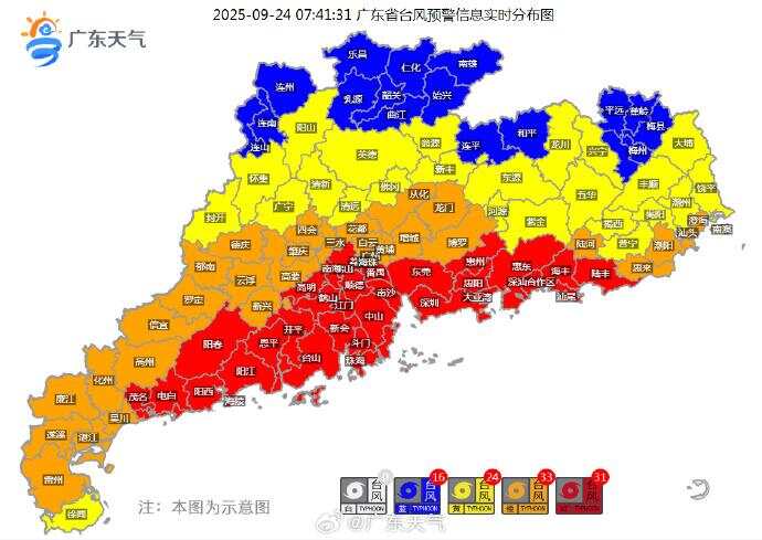 截至7时41分,广东有31个台风红色预警、33个台风橙色预警、24个台风黄色预警、16个台风蓝色预警信号生效,其中台风红色预警信号,覆盖汕尾、惠州、深圳、东莞、广州、佛山、中山、珠海、江门、阳江、茂名等地的市县区范围。